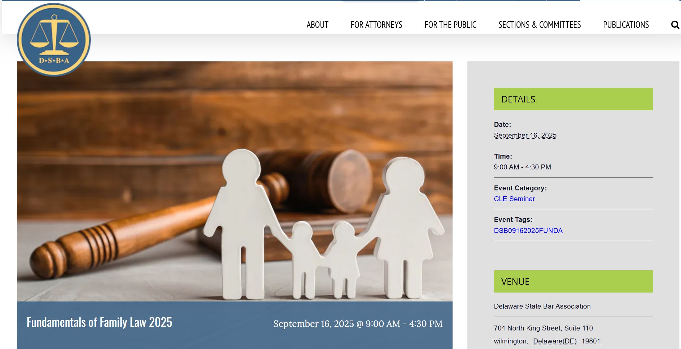On Tuesday, September 16, 2025, Obermayer family law partner Jill Spevack Di Sciullo will co-present at the Delaware State Bar Association’s (DSBA) CLE program, “Fundamentals of Family Law 2025.” Jill’s panel will focus on guardianship, offering a practical and insightful discussion designed to help attendees navigate the legal and procedural aspects of guardianship cases. The session will provide valuable guidance for both new and experienced practitioners in the family law field.